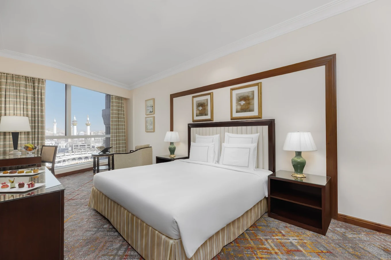 الغرف مصممة بأناقة على الطراز العصري، وتجمع بين الراحة والفخامة، مع نوافذ بانورامية تمنح الضيوف تجربة روحية فريدة. يضم الفندق مطعمًا راقيًا يقدم وجبات عالمية وشرقية، بالإضافة إلى خدمة غرف على مدار الساعة ومرافق راحة فاخرة تناسب الحجاج والمعتمرين.